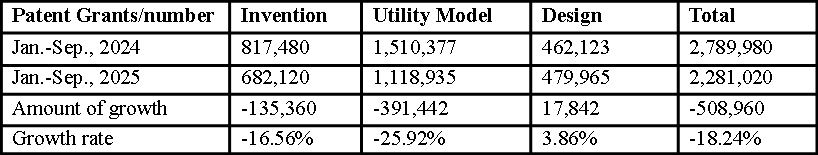 China’s Patent Grants Saw a Decline in the First Nine Months of 2025: Invention by 16.56%; Utility Model by 25.9%