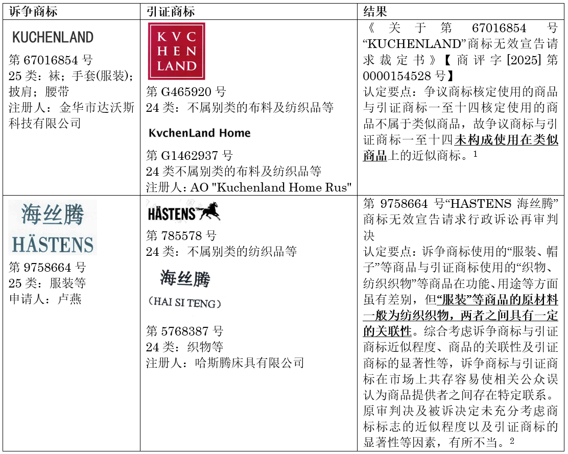 但是在第9758664号“HASTENS海丝腾”商标无效宣告请求行政诉讼再审判决中,诉争商标、引证商标的指定商品同样第25类的服装和第24类的“不属别类的纺织品等”。但是最高院则认定“服装等商品的原材料一般为纺织织物,两者之间具有一定的关联性”,依据商标法第30条,对诉争商标予以无效宣告。