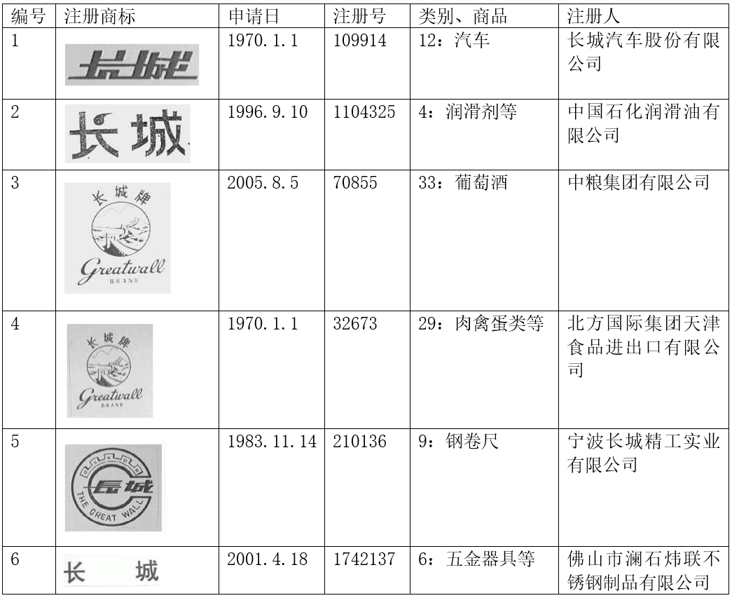 下述列表中的“长城”商标不仅在非类似商品上共存多年,而且在各自领域均具有较高知名度。