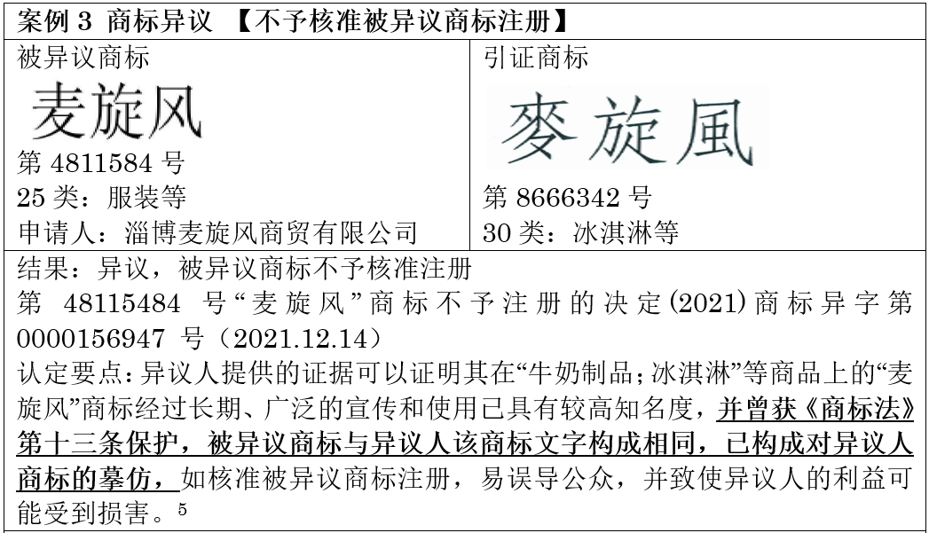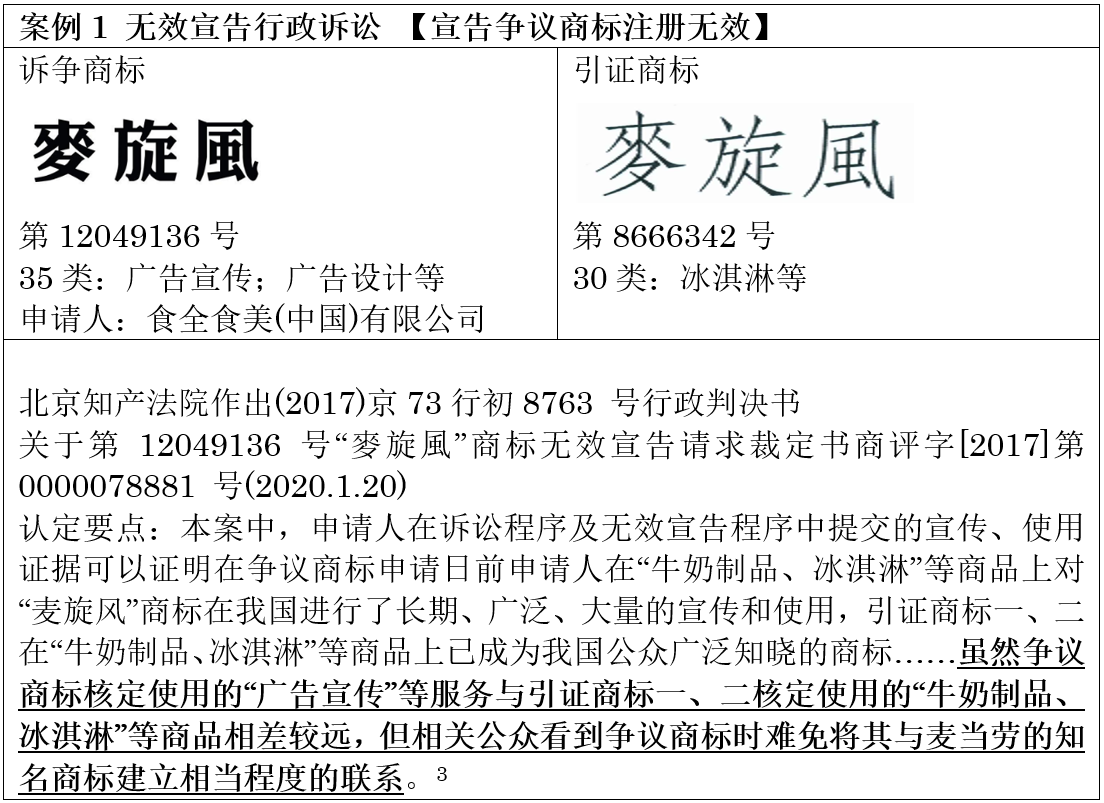 但是,到了2023年,麦当劳公司对第3类“化妆品”等商品上注册的“麦旋风”提起无效宣告时,国知局认为争议商标的指定商品与麦当劳公司的“麦旋风”商标主张知名的冰淇淋等商品在功能用途、销售渠道等方面关联性较弱,故未基于《商标法》第13条第3款对引证商标“麦旋风”给予跨类保护。