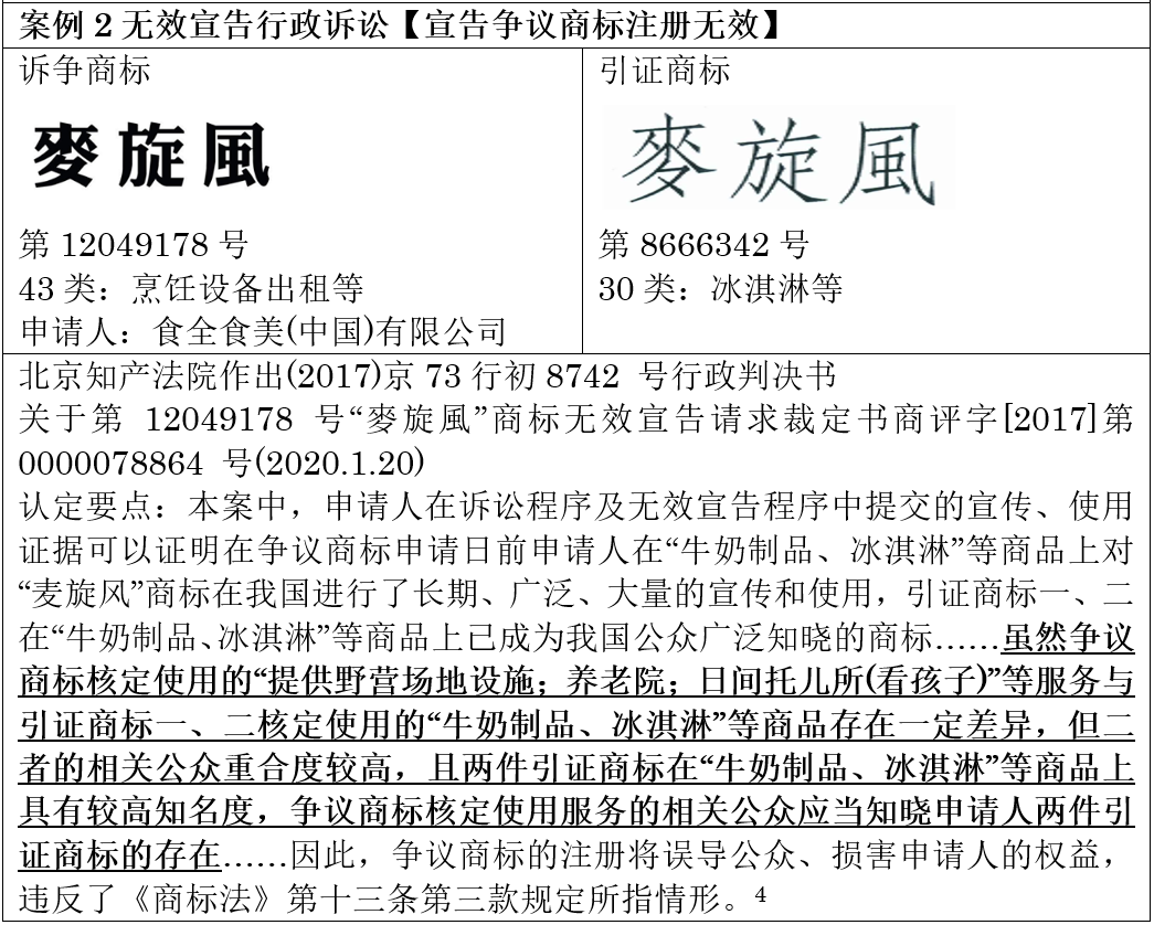 上述前两个案子是麦当劳公司于2017年提起的两件行政诉讼,北京知产法院作出判决,认定“麦旋风”为驰名商标并对在第35类的广告宣传、第43类的烹饪设备出租等上注册的“麦旋风”商标予以无效宣告。上述判决形成于2019年末,国知局于2020.1.20重新作出无效宣告请求裁定书。
