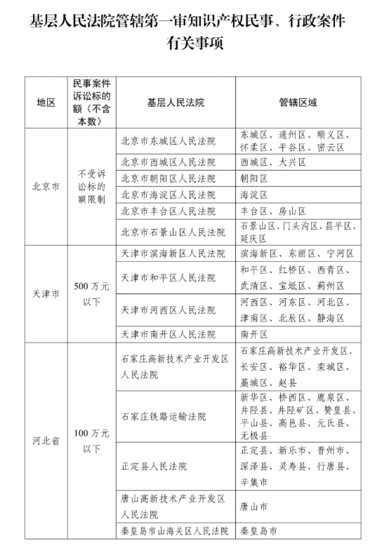 根据《最高人民法院关于第一审知识产权民事、行政案件管辖的若干规定》(法释〔2022〕13号),结合知识产权审判实际,最高人民法院对具有知识产权民事、行政案件管辖权的基层人民法院及其管辖区域作了调整。现予以印发,自2025年10月1日起施行。
