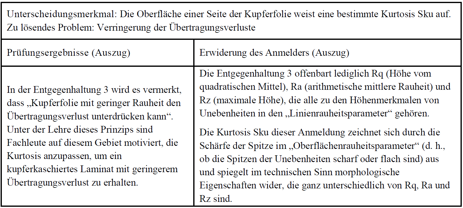 In Bezug auf dieses Merkmal ist der Prüfer der Ansicht, dass die Entgegenhaltung 3 einen technischen Hinweis liefert. Dazu hat der Anmelder Beweise von den Webseiten vorgelegt, die sich auf die Oberflächenrauheit beziehen und beweisen, dass die in dieser Anmeldung definierte Kurtosis Sku eine völlig andere technische Bedeutung hat als die in Entgegenhaltung 3 offenbarten Rq, Ra und Rz.