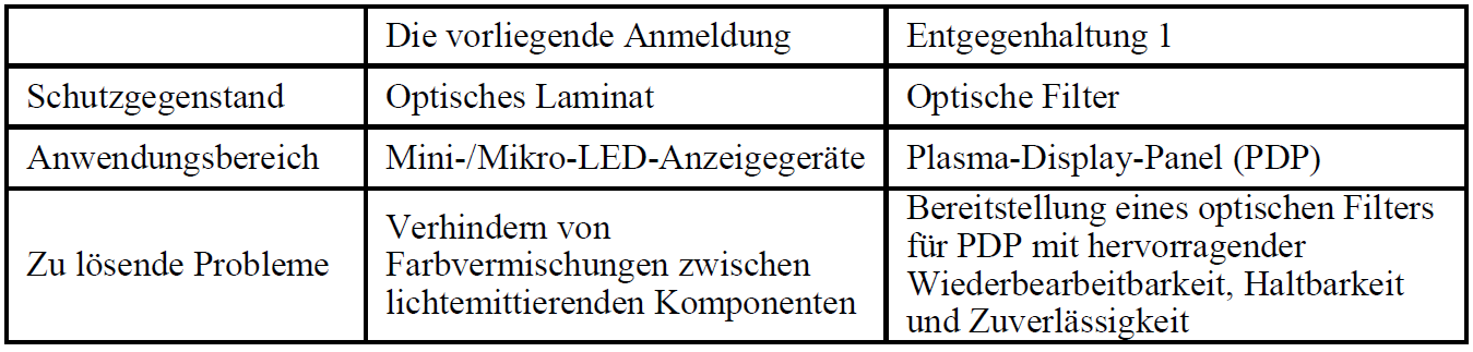 In diesem Fall beansprucht der Anspruch 1 den Schutz von einem optischen Laminat, wie in der folgenden Tabelle dargestellt, das sich von der Entgegenhaltung 1 sowohl beim Anwendungsbereich als auch beim zu lösenden Problem unterscheidet.