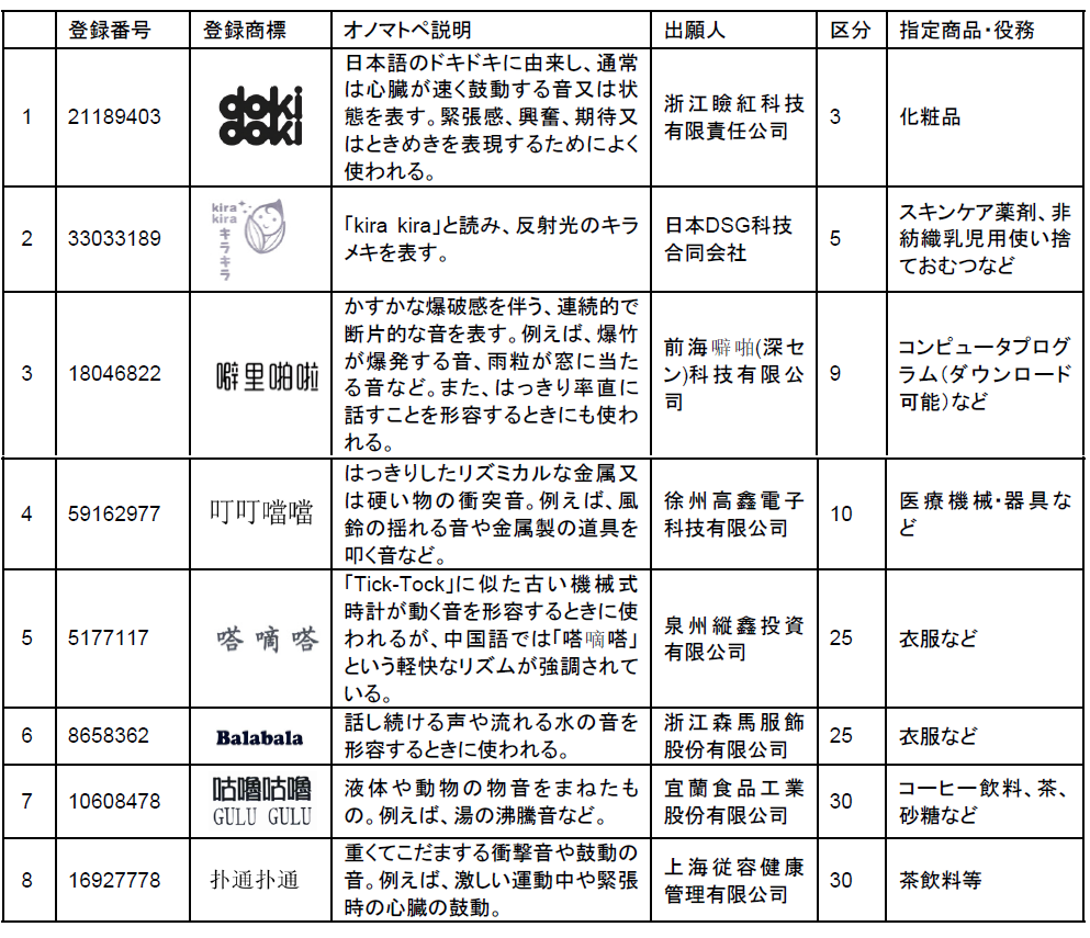 ただし、上記4つの事例は主にサービス業界に集中していることに注意するべきである。では、商品分野においても、オノマトペは同様に商標登録の可能性を有しているのであろうか。実務からみれば、登録可能性は確かにある。例えば、下表に示すとおり、中国商標網の公開データによれば、これまでにすでに多くのオノマトペが商品商標として登録が許可されている。これは、オノマトペの商品商標における登録可能性を十分に証明している。