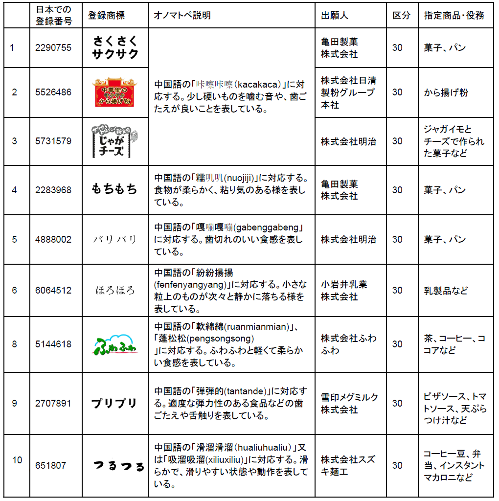 さらに、日本特許庁の商標データベース(J-Plat Pat)の公開情報によれば、オノマトペを活用した日本企業の商標出願が非常に多くなっていることが分かった。例えば、歯触りの良い食感を表す「サクサク」というオノマトペ商標は、すでに第3類、第5類、第8類、第9類、第21類、第29類、第30類、第38類、第42類、第43類という9つの国際分類にわたって33件の登録実績があり、うち第30類の食品関連商品だけでその約半数に近い15件を占めている。この現状を受けて、学界では、商標分野における有用なオノマトペ資源の枯渇リスクを指摘する一部の学者の声も上がり始めている。以下に、第30類に登録された食品の食感関連のオノマトペ商標を例に、日本におけるオノマトペ商標の登録状況を紹介する。