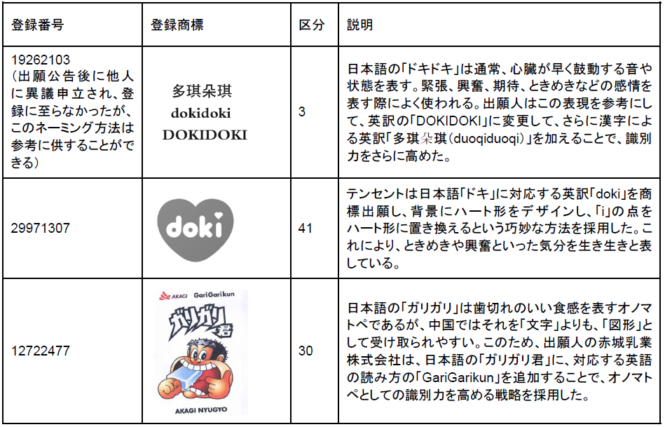 筆者は、実例研究を通じて、商標登録の観点から、中日両国における現在のオノマトペ商標の登録状況を比較検討することで、オノマトペを商標登録しようとしている企業に有益な示唆を提供できることを期待している。